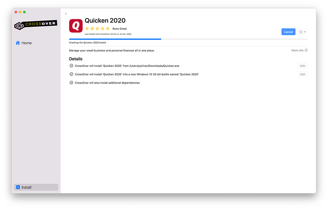 A listed application is an application for which CrossOver has a predetermined install profile (i.e., a CrossTie). In some cases, CrossOver has access to the installer file or knows the location of the file. In the example below, we will install Quicken 2020. A CrossTie exists for Quicken 2020, but CrossOver doesn't have access to the installer file.